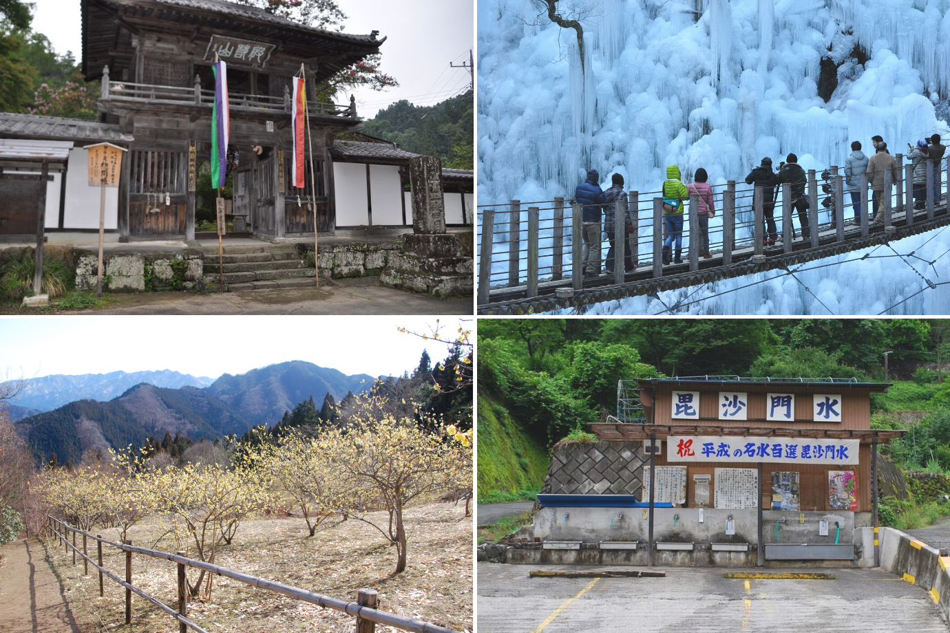 (左上)札所三十二番法性寺、(右上)尾ノ内氷柱、(左下)ロウバイ園、(右下)毘沙門水 取水場 ※画像提供:小鹿野町観光協会